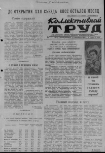 17 сентября 1961 года, М 112 КОЛЛЕКТИВНЫЙ ТРУД СТРАНИЦА ВЫХОДНОГО ДНЯ Вечер в колхозе Догорает червоный закат, Всюду золота брызги сияют. Листья-струйки, как будто го рят, Золотое тепло разливая. Шепчут листья о чем-то в садах, Где-то девичьи слышатся песни... После жаркой работы в полях Как хорош этот вечер чудесный! Он прохладной рукой обоймет Знойным солнцем сожженные плечи, В тихий сад за собой уведет И смеяться заставит беспечно. А когда говорунья-гармонь Ясным голосом сердца коснется, Дружной песни ликующий звон Широко по селу разольется. Про свой радостный труд запоют, Про колхозную вольную долю. Песни сердце в объятья берут И уносят к далекому полю. Слава тем,кто опять на полях> Потрудился до жаркого пота! Крепко любит заботу земля, Безупречную любит работу. Льется песня стройна и сильна, \ Выше, выше берет запевала... Богатеет, мужает страна. Слава партии! Родине слава! А. Федотов. * * * Хорошо провели, летние каникулы школьники Октябрьской восьмилетней школы. Некоторые из них совершили интересные экскурсии, занимались рыбалкой, купались, загорали. Старшеклассники принимали участие в общественно п о л е з н о м труде — работали на полях и лугах совхоза им. Дзержинского. Книголюбы, конечно, не забывали о чтении. Интересно было заглянуть и в новый учебник. ' НА СНИМКЕ: Маша Иванова получает консультацию у учительницы Липинской М. И. Фото И. Гауркова. СЕСТРЕНКЕ Отношением каждого человека к” своему родному языку можно совершенно точно определить не только о его культурном уровне, но и о его общественной ценности. Настоящая любовь к своей Родине немыслима без любви к своему языку. Человек, безразличный к нему,—вредный самой своей сущностью, потому что его безразличие к языку объясняется полным равнодушием к прошлому, настоящему и будущему своего народа. К. Паустовский. Сестра моя, Надюшка, дорогая, Ну,как же мне,тобою, не гордиться] Раскрыв письмо,я мужество черпаю| Я начинаю сам тобой искриться. Залюбовавшись тонкою березкой,| Что распустила лиственные косы, Тебя я вспомнил сероглазой козко* И бесиком смешным беловолосым.| Припомнилась моя несправедливость:! Не раз, бывало, досаждал руками, Но что бы между нами ни случилось Ты никогда не жаловалась маме. А тутже, кулачком мне угрожая, Сквозь слезы, нараспев и очеш громко| Все говорила: —Погоди, тебе я Когда-то тоже..,—и (меялгсь звонко.| Веселою—такой и называли Тебя соседи,—без крупинок лести, I Кто знал, что в девочке на сердце! созревали| Веселие с настойчивостью вместе. Десятилетка. С матерьюпростилась...| Райком. Путевка. Трудности—подстать. И хоть ты подвига еще не совершила, Но жизнь тебе сегодня ставит„пять“! П. Таёжный. В этих коротких корреспонденциях сообщается о событиях, происшедших всего лишь за одни сутки 14 сентября. За один день и „ КАРАСУКСКИИ хлебопри- l l d . емный пункт шли бесконечные колонны автомобилей с зерном нового урожая. За сутки на элеватор поступило около шестнадцати тысяч центнеров хлеба, из них более 14 тысяч сдали трудящиеся нашего района. Особенно большую активность в хлебосдаче проявил совхоз им. Дзержинского. В’ закрома государства он засыпал в этот день 4773 центнера зерна. В совхозе первенство держит седьмая ферма (управляющий т. Гер- герт). Хлеборобы этой фермы уже отправили на Карасукский элеватор свыше 41 тысячи центнеров зерна при плане 28 тысяч центнеров. ПОЧ