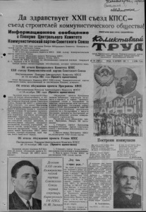 Орган Карасукского райкома Коммунистической партии Советского Союза и районного Совета депутатов трудящихся Новосибирской области № 125 (2927) | СРЕДА, 18 ОКТЯБРЯ 1961 Г. | ЦЕНА 2 коп, , / j б/jSttSjMJCyYHV**— ^ Да здравствует XXII съезд КПСС— съезд строителей коммунистического общества! Информационное сообщение ПРМЕТАГИИ ВСЕХ СТРАН, СОЕДИНЯЙТЕСЬ! о Пленуме Центрального Комитета t rnt-,» лРг-пгг Коммунистической партии Советского Союза 14 октября 1961 года состоялся Пленум Центрального Комитета Коммунистической партии Советского Союза. Пленум обсудил следующие вопросы: 1. Об отчете Центрального Комитета КПСС XXII съезду Коммунистической партии Советского Союза. 2. Об итогах обсуждения проекта Программы КПСС. 3. Об итогах обсуждения проекта Устава КПСС. Пленум ЦК' КПСС заслушал по обсуждавшимся вопросам доклады товарищей Н. С. Хрущева и Ф. Р. Козлова. Пленум принял соответствующие постановления, которые публикуются ниже. Об отчете Центрального Комитета КПСС XXII съезду Коммунистической партии Советского Союза Постановление Пленума Центрального Комитета КПСС от 14 октября 1961 года (Принято единогласно) Отчет Центрального Комитета КПСС XXII съезду Коммунистической партии Советского Союза, представленный на рассмотрение Пленума, утвердить. Об итогах обсуждения проекта Программы КПСС Постановление Пленума Центрального Комитета КПСС от 14 октября 1961 года (Принято единогласно) Заслушав доклад товарища Н.С.Хру- Обсуждение проекта Программы щева об итогах общепартийного и все- вызвало небывалую творческую актив- народного обсуждения проекта Програм- ность в партии и в народе, продемон- мы Коммунистической партии Советского стрировало тесное и неразрывное их Союза, Пленум ЦК КПСС с удовлетворе- единство, непреклонную волю претворить нием отмечает, что проект Программы, в жизнь программу построения комму- в обсуждении которого приняло участие низма в СССР. Поступившие в ходе об- ролее 9 миллионов членов и кандидатов суждения многочисленные предложения партии и свыше 82 миллионов трудящих- коммунистов и беспартийных к проекту ся, единодушно одобрен на собраниях Программы проникнуты благородной за- всех первичных партийных организаций, ботой об умножении успехов коммуни- районных, окружных, городских, обла- стического строительства, стных и краевых конференциях, на съез- Рассмотрев итоги обсуждения про- дах компартий союзных республик, на екта Программы, Пленум ЦК поста- многочисленных собраниях трудящихся новляет: предприятий, колхозов, учреждений, во- 1. Утвердить проект Программы инских частей, профсоюзных и комсо- Коммунистической партии Советского мольских организаций. Таким образом, Союза с внесенными дополнениями и из- проект новой Программы КПСС нашел менениями. полную, горячую поддержку всей пар- 2. Внести проект Программы КПСС тин, всего советского народа, на рассмотрение XXII съезда партии. Об итогах обсуждения проекта Устава КПСС Постановление Пленума Центрального Комитета КПСС от 14 октября 1961 года (Принято единогласно) Заслушав доклад товарища Ф.Р,Коз- 1, Утвердить проект Устава КПСС с лова об итогах обсуждения проекта Ус- внесенными изменениями и дополнениями, тава КПСС, Пленум ЦК КПСС поста- 2. Внести проект Устава КПСС на новляет: рассмотрение XXII съезда партии. Построим коммунизм Делегат X X I I съезда Коммунистической партии Советского Союза п