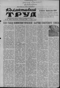 7 &bu %4t Пролстарый всех стран, соединяйтесь) fCbUue/cmu&mu В Совете Министров СССР Орган Карасукского райкома Коммунистической партии Советского Союза и районного Совета депутатов трудящихся Новосибирской области______ Иди навстречу пожеланиям трудящихся, Совет Министров СССР постановил перенести выходной день с воскресенья 5 ноября на понедельник 6 ноября 1961 года. J\fe 130 (2932) { Воскресенье, 29 октября 1961 г. | Цена 2 коп. XXII СЪЕЗДКОММУНИСТИЧЕСКОЙ ПАРТИИСОВЕТСКОГО СОЮЗА МОСКВА, 25 октября (ТАСС). В столице нашей Родины — Москве, в Кремлевском Дворце съездов, продолжает свою работу XXII съезд Коммунистической партии Советского Союза. Сегодня на утреннем заседании съезд приветствовали горячо встреченные делегатами и гостями представители зарубежных коммунистических и рабочих партий товарищи: Хесус Фария—генеральный секретарь ЦК Коммунистической партии Венесуэлы, Кнуд Есперсен — председатель Коммунистической партии Дании, Пауль де Гроот—генеральный секретарь ЦК Коммунистической партии Нидерландов, Хильберто Виейра— политический секретарь ЦК Коммунистической партии Колумбии, Лоренс Шарки —генеральный секретарь Коммунистической партия Австралии, Никола Шауи—секретарь ЦК ливанской Коммунистической партии. Затем съезд продолжал обсуждение отчета Центрального Комитета КПСС, проекта Программы Коммунистической партии Советского Союза и отчетного доклада Центральной ревизионной комиссии КПСС. Делегаты заявляют, что советские люди сделают все, чтобы успешно выполнить величественные планы построения коммунистического общества. За тысячу дней семилетки ленинградцы создали десятки первоклассных судов, среди них атомный ледокол «Ленин», рыбоконсервный плавучий завод «Андрей Захаров» и многое другое, заявил судосборщик Балтийского завода имени С. Орджоникидзе тов. В.А. Смирнов. Оратор рассказывает о том, что вместе с другими ленинградскими заводами балтийцы выступили инициаторами соревнования за выполнение заданий семилетки по росту производительности труда в пять лет. На заводе сейчас свыше 50 бригад коммунистического труда, 85 процентов рабочих участвуют в соревновании за коммунистический труд. Тов. Смирнов приводит примеры из жизни своей бригады. Они свидетельствуют о том, что коллектив заботливо растит нового человека, для которого законом жизни становится моральный кодекс строителя коммунизма, изложенный в проекте Программы. Первый секретарь ЦК Компартии Молдавии товарищ ■ н и нашу социалистическую Родину говорит о величайших победах, одержанных партией, советским народом после XX съезда КПСС во всех областях народного хозяйства, науки, культуры, общественно- политической жизни, международной политики. Он доложил съезду о достижениях Молдавии в развитии промышленности и сельского хозяйства. Основные фонды колхозов после сентябрьского Пленума ЦК 1953 года выросли в пять раз. За последние два года в селах республики ио- строено около 50 тысяч домов. За это время колхозники и рабочие совхозов посадили 82 тысячи гектаров новых садов и виноградников. Проект Программы нашей партии, говорит директор «Уралмашзавода» тов.В.В.Кро- тов, выработанный её Центральным Комитетом—великий марксистско-ленинский документ нашей эпохи. Многотысячный коллектив «Уралмашзавода» успешно справляется с поставленными перед ним задачами. Вып