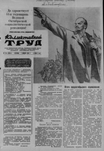 7 ноября 1961 года, № 134 КОЛЛЕКТИВНЫЙ ТРУД 3 Р » » ВЕСЕЛО ВСТРЕЧАЮТ ПРАЗДНИК 44 годовщина Октября—великий праздник советского народа. В эти дни в 1917 г. утвердилась в нашей стране власть народа. Вот новому и стар и млад чувствуют себя сегодня особенно приподнято, •празднично. Радостен вдвойне праздник 7 ноября животноводам артели «Маяк Ильича». Коллективы четвертой и пятой Оршад перевыполнили планы но производству if продаже государству продуктов животноводства. По плану животноводам четвертой бригады намечалось надоить и сдать государству 2158 центнеров молока, а сдано 2578 центнеров. Более 3300 центнеров сдали ыа- курские животноводы. 'Имена иередовых доярок артели, труд которых создал эти достнже- ♦ дым годом. Евдокия Мустафинова недавно в животноводстве. В прошлом году она набрала в группу первотелок. Ей довели задание: от каждой первотелки получить 16 центнеров. Молодую доярку знали в коллективе, верили, что с обязательством справится. Оказалось, что Е. Мустафинова превзошла ожидания. От каждой первотелки получено за 10 месяцев по 21 центнеру молока. Упорен труд доярок, щедра и оплата за труд. Кроме заработка каждая из этих доярок получила за сверплановыз надои по ЮО и более рублей дополнительной оплаты. Весело встречают праздник животноводы. С. Коваленко. ♦ И д е т сверхплановая продукция Славно потрудились нынче хоро- шенские животноводы. Они встречали выполнением планов по производству и продаже государству молока XXII съезд партии. А 44-ю годовщину Великой Октябрьской социалистической революции встречают перевыполнением планов производства и сдачи государству яиц, шерсти и сверхплановой сдачей молока. К 7 ноября совхоз сдал около 2,5 тысяч центнеров молока. И не случайно накануне праздника на торжественных вечерах, посвященных дню Великого Октября, на собраниях с теплотой и гордостью произносят имена передовиков животноводства: доярок Анны Кошель, Евдокии Со- роченко, Анны Гришко, которые за 10 месяцев надоили более чем по 2400 литров молока от каждой коровы, птичницы Анны Мурашко, получившей на ку- рицу-несушку более 70 штук яиц, чабанов Ивана Серцюка, Жакена Тизек- паева, получивших богатый приплод и высокий настриг шерсти. У этих животноводов слова не расходятся с делом. Обязательства, принятые тружениками, выполняются успешно. П. Белянин, главный ветврач. ния,известны не только в колхозе, а в районе и даже в области. Лю- бюно и образно зовут их в народе маяками. Своими делами они освещают дорогу в коммунизм. Вот уже несколько лет Марин Миронова получает рекордные надои. Нынче в начало года взяла обязательство от каждой коровынадоить по 28 центнеров молока. Крепко держит словодоярка. За десять месяцев получено по 26 центнеров. Нет сомнений, что к коиду года обязательство будет выполнено. Крепко помнтя о принятом обязательстве п доярки Ольга Ромих, надоившая 2542 кг, Анна Морозова —2530 кг, Галина Тресницкая— 2539, Елена Дридягер, надоившая 2500 кг. Ряды передовиков растут с кажМЫ В КОММУНИЗМ ИДЕМ Мы в коммунизм идем по ленинским заветам Нас к цели партия любимая ведет. Взгляните в даль— как в солнечном рассвете Страна Советов молодо цветет По площадям шагают с песней люди, Счастливее я песен не слыхал. Мы любим жизнь, мы любим труд и будем Идти путем, что Ленин указал. Мы покорили небеса и воды, И коммунизм с каждым днем смелей К нам входит в жизн
