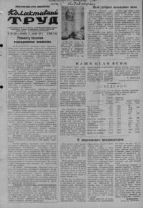 ПРИЛЕТАРИИ ВСЕХ СТРАН, СОЕДИНЯЙТЕСЬ! IkbJjueJcnvu&HSM, * у ъ о с . к л , ^ сЛ Ч Н * ^ / , * и Д ^ Х Поля удобряет молодежное звено Орган Карасукского райкома Коммунистической партии Советского Союза и районного Совета депутатов трудящихся Новосибирской области №149 (2951 |) ПЯТНИЦ», 15 декабря 1961 Г. I ЦЕЦ> 2 «и. -------Ремонту техникиповседневное внимание X XИ съезд КПСС поставил перед тружениками села ответственные задачи по дальнейшему увеличению производства продуктов сельского хозяйства. Д л я того, чтобы претворить в жизнь намеченные рубежи, предстоит многое сделать. Одной из важнейших практических задач сейчас является образцовая подготовка к весеннему севу. Ведь от того, как колхозы и совхозы подготовятся к этой кампании, будет во многом зависеть будущий урожай, который должен быть весомым вкладом в борьбу за осуществление программы строительства коммунизма. Чтобы обеспечить получение в будущем году высокого урожая, необходимо в каждом хозяйстве организованно провести ремонт техники. Механизаторы нашего района\выступили инициаторами областного соревнования за досрочный и качественный ремонт тракторов и других сельскохозяйственных машин. Труженики полей ре- |< шили завершить ремонт тракторов к 15 января 1962 года, а подготовку сельскохозяйственного инвентаря к 23 февраля. Борясь за выполнение принятых обязательств, во многих хозяйствах успешно готовят !; технику к полевым работам. Лучше других ведут ремонт тракторов механизаторы колхоза „Вперед к коммунизму". 2/спех их работы заклю чается в том, что они сумели создать у себя ремонтную базу, сделали мастерскую, установили токарный станок и многие ремонтные операции выполняют своими силами. Труженики артели намерены свои обязательства выполнить раньше намеченного срока. Намного лучше прошлого года готовят технику к весне механизаторы колхоза им. Куйбышева. Они полностью завершили подготовку сельскохозяйственного инвентаря и заканчивают ремонт тракторов. Неплохо ведут ремонт техники механизаторы, колхозов им. Тельмана, „Новая семья", „Маяк Ильича“ и совхоза „Октябрь". Вместе с тем в целом по району нельзя признать удовлетворительным ход выполнения взятых обязательств. Осталось немного времени, всего месяц, а нам надо поставить на линейку готовности столько машин, сколько мы подготовили за два с половиной месяца. Медленно идут ремонтные дела в артели им. Жданова и Студеновском совхозе, где на л и нейке готовности стоит всего одна треть тракторов. Особую тревогу вызывает ход подготовки техники в отделении „Сельхозтехники", где ремонтируется большинство колхозных машин. Взятое коллективом отделения обязательство к концу декабря отремонтировать 107 тракторов, а к 15 января 121, находится под угрозой срыва. На 10 декабря здесь подготовлено всего 52 машины. Если и дальше такими темпами будет готовиться техника, то мы можем провалить взятое обязательство и остаться болтунами. Руководителям отделения надо сделать из этого самые серьезные вывооы. Не совсем благополучно обстоят дела и с качеством ремонта. Должного контроля за выходом машин не установлено. Поэтому некоторые тракторы иногда не успеют дойти до колхоза и уже выходят из строя. Наблюдаются случаи, когда из мастерской выходят машины без стекол, с привязанными проволокой капотами, | незашплинтованными пальцами гусениц и други- ми серь