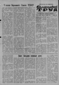 V сессия Верховного Совета РСФСР Ярким светом решений XXII съезда партии, принятой на нем программы строительства коммунизма озарена работа V сессии Верховной) Совета РСФСР. Гордостью одержанных побед, сознанием величественных задач были проникнуты речи депутатов, приступивших утром 15 декабря к обсуждению проектов Государственного плана развития народного хозяйства и бюджета республики на 1962 год, Депутат В. И. Черный (Тамбовская область) сообщил, что па проходящих в эти дни в городах и селах области рабочих собраниях и сельских сходах их участники, обсуждая и единодушно одобряя решения XXII съезда партии, намечают мероприятия, обеспечивающие успешное претворение их в жизнь. План 11 месяцев промышленность области перевыполнила. Колхозы и совхозы в нынешнем году произвели более ста миллионов пудов зерна,значительно перевыполнили план продажи хлеба государству. Радостны перспективы развития хозяйства области в 1962 ГОДУЗа годы Советской власти неузнаваемо преобразилась экономика и культура Карачаево-Черкесской автономной области. Об этом рассказал депутат 3. К. Карданов. Теперь эта область располагает высокоразвитой промышленностью и крупным механизированным сельским хозяйством. Поголовье обществен- животноводства за последние несколько лет здесь возросло, в 2,4 раза, а про- дуктивность--более чем в два раза. Оратор говорит о торжестве ленинской национальной политики, укреплении дружбы народов, о создании в республике квалифицированных национальных кадров. Резервы—па службу семилетки. Внести как можно больший вклад в чашу народного изобилия, в строительство коммунистического общества. Эти мысли красной нитью проходят через выступления всех ораторов. Коллектив Анжерского машиностроительного завода, сказал депутат В. И. Залужный(Ке- меровская область), на всех участках объявил борьбу с потерями рабочего времени под лозунгом «Каждый час—строительству коммунизма!» Горняки шахты № 5 Киселевского рудника, обсуждая итоги XXII съезда партии, решили перевыполнять государственный план добычи угля при обязательном условии—экономии лесоматериа лов. Два месяца в году они будут работать на лесе, который сберегут благодаря его повторному использованию.Куз- басс—это район Сибири, где продукция отраслей тяжелой индустрии составляет более 90 процентов всего объема производства, подчеркнул депутат. В 1965 году объем валовой продукции по этому экономическому району должен увеличиться в два раза, т. е. вырастет второй такой экономический район, каким является Кузбасс. О существенном вкладе в семилетку нефтяников Татарии, говорил депутат А. А. Абд- разяков. Высокие показатели достигнуты здесь, в частности, бригадами эксплуатационного бурения. В прошлом году, например, средняя проходка на бригаду составила 21565 метров, что вдвое превышает средние скорости бурения по стране. Депутат А.С. Бирюков(При- морский край) сообщил,- что в результате ввода новых производственных мощностей, внедрения передовой техники и технологии выпуск промышленной продукции, намеченный се- милетним планом на 1965 год, по ряду отраслей промышленности будет достигнут в крае уже в текущем году. 1962 год явится годом рождения новых фабрик и заводов, современной техники. Комбайновые заводы Ростовского экономического района начнут в будущем году массовое производство са