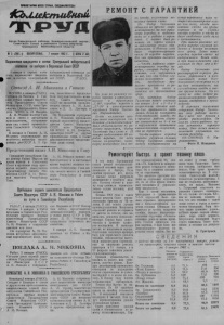 ПРОЛЕТАРИИ ВСЕХ СТРАН, СОЕДИНЯЙТЕСЬ! РЕМОНТ С ГАРАНТИЕЙ Орган Карасукского райкома Коммунистической партииf Советского Союза и районного Совета депутатов трудящихся Новосибирской области № 3 (2861Л ВОСКРЕСЕНЬЕ,7 января 1962 Г. | ЦЕНА 2 коп. Выдвижение кандидатов в состав Центральной избирательной комиссии по выборам в Верховный Совет СССР 4 января в стране нача- избирательной-комиссии по лось выдвижение кандида- выборам в Верховный Сотов в состав Центральной вет СССР. (ТАСС). Отъезд А. И. Микояна в Гвинею МОСКВА,4 января.(ТАСС). Сегодня из Москвы в Гвинею отбыл первый заместитель Председателя Совета Министров СССР, член Пре- зидума Центрального Комитета КПСС А. И. Микоян. А. И. Микоян посетит Гвинею в связи с дружеским приглашением, направленным ему главой правительства Гвинейской Республики. В поездке в Гвинею А. И. Микояна сопровождают заместитель министра иностранных дел СССР А. Л. ОрПредстоящий визит А.И. Микояна в Гану Президент республики Гана доктор Кваме Нкрума во время визита в Советский Союз в прошлом году пригласил первого заместителя Председателя Совета Министров СССР А. И. Микояна посетить Республику Гана. Пребывание первого заместителя Председателя Совета Министров СССР А. И. Микояна в Рабате по пути в Гвинейскую Республику РАБАТ, 4 января.(ТАСС). Сегодня, 4 января, в Рабат проездом в Гвинейскую Республику прибыли первый заместитель Председателя Совета Министров СССР А. И. Микоян и сопровождающие его лица. На аэродроме А. И. Микояна встречали официальные марокканские лица, поПОЕЗДКА А. Рабат, 5 января (ТАСС). Сегодня днем первый заместитель Председателя Совета Министров СССР А. 14. Микоян и сопровож- ПРИБЫТИЕ А. И. МИКОЯНА В Конакри,5 января.(ТАСС). Сегодня в Конакри в связи с дружеским приглашением, направленным главой правительства Гвинейской Республики, прибыл первый заместитель Председателя Совета Министров СССР, член Президиума Центрального Комитета КПСС А. И. Микоян. лов, заместители председателя государственного комитета Совета , Министров СССР по внешним экономическим связям А. И. Алиханов и Д. Д. Дегтярь и другие. На Внуковском аэродроме А. И. Микояна провожали первый заместитель председателя Совета Министров СССР, член Президиума ЦК КПСС А. Н. Косыгин, министры СССР и другие официальные лица, а также дипломатические представители ряда стран. А. И. Микоян принял это приглашение и в настоящее время выразил желание посетить Республику Гана после своего визита в Гвинейскую Республику в этом месяце. сол Марокко в СССР Башир Бен Аббее, представители дипломатического корпуса, а также посол СССР в Марокко Д. П. Пожидаев и сотрудники советского посольства. 5 января A. II. Микоян вылетел из Рабата в Конакри. И. МИКОЯНА дающие его лица отбыли на самолете из столицы Марокко Рабата в Гвинейскую Республику. ГВИНЕЙСКУЮ РЕСПУБЛИКУ А. И. Микояна сопровождают заместитель министра иностранных дел СССР А. Л. Орлов, заместители председателя Государственного комитета Совета Министров СССР по внешним экономическим связям А. И. Алиханов и Д. Д. Дегтярь и другие официальные лица. На узле по ремонту коробок передач и сервомеханизмов к тракторам „0-80“, коробок передач к „ДТ-54“ и автомашинам трудится Федор Тихонович Мирошниченко. Когда коллектив центральной мастерской отделения „Сельхозтехники" брал обязательство по ремонту тракторов, Федор Ти