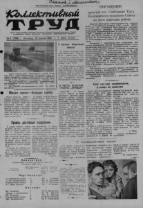 Пролетарии всех стран, соединяйтесь > ОБРАЩЕНИЕ граждан пос. Свободный Труд Калиновского сельского Совета 'TJP'Vfl Орган Карасукского райкома Коммунистической партии Советского Союза и районного Совета депутатов трудящихся Новосибирской области Кд 8 (2966) Т Пятница,19 января 1962 г. | Цена 2 коп. ко всем жителям района Широко развернув социалистическое соревнование за достойную встречу ХХП съезда КПСС, граждане пос. Свободный Труд добились хороших результатов в продаже государству излишков продуктов животноводства. В среднем на корову в 1961 г. продано по 516 кг молока. А такие сдатчики как М.И. Орлова, А. И. Мозговая, М. И. Королева М. И. Кошкарева, Н. И. Кривошапко, сдали на молокоприемный пункт по тонне и более моСовхоз «Чистюньский» Топчихинского района Алтайского края —опытно-показательный. В последние годы хозяйство выращивает высокие урожаи зерновых и технических культур. В 1961 году полеводы получили на площади, превышающей 6 тысяч гектаров, по 16,2 центнера зерновых с га. Большое значение для повышения урожайности имеет снегозадержание, которое проводится этой зимой на 7 тысячах гектаров. НА СНИМКЕ: снегозадержание на полях 1-го отделения совхоза. _____ К+........ . ................................... Много снега—больше хлеба Много снега на полях— больше хлеба в закрамах,— говорит народная мудрость. Оно и понятно. Ведь как подсказано наукой, один сантиметр снега—это тонны воды на гектаре. А. сельские энтузиасты зимней агротехники задерживают снегопахами на полях за период зимы целые реки. Пример, достойный подражания В народе говорят: жизнь прожить, не поле перейти. Много в жизни разных дорог. И по-разному люди идут по ним. Одни—меняют одну за другой профессии и места, другие —всю жи: на одном место живут трудятся. Полюбится им одна работа и станет призванием. К людям, не любящих частых перемен должностей и мест, относится простая, скромная женщина Е. Г.Эр- горт. 15 лет проработала В первой бригаде артели „Новая семья" ведет снегозадержание механизатор Александр Мис.хзк. С утра до вечера в морозном воздухе слышен мерный рокот трактора, а за ним остаются высокие снежные валы. Здесь эта работа проведена уже на 200 га. Н. Гончаров. она дояркой на 10 ферме совхоза им. Дзержинского. Л сейчас выращивает телят, не допуская падежа. В телятнике у нее всегда чисто, сухо,телята во-время накормлены, напоены. Кажн дый теленок дает суточный привес по 500 граммов. Хочется поставить в пример всем нашим животноводам хорошее отношение к делу скромной труженицы Екатерины Готфридовны Эргорт. Н. Бартель, зоотехник. В окружную избирательную комиссию 17 января состоялось собрание коллектива Карасукского тепловозного депо, посвященное выборам члена окружной избирательной комиссии по выборам в Верховный Совет СССР. По предложению главного бухгалтера депо Н. А. Шер- шова собрание единогласно избрало членом окружной избирательной комиссии помощника машиниста тепловоза коммуниста Евгения Михайловича Протасова. В ЧЕСТЬ 50-ЛЕТИЯ ГАЗЕТЫ „ПРАВДА44 МОСКВА, 17 января. (ТАСС). Борьбу за право называться бригадой имени 50-летия газеты „Правда" начал коллектив коммунистического труда токарей, руководимый Альбертом Кубаревым на заводе имени Владимира Ильича. Эта бригада первой из коллективов электромашиностроителей предприятия начала соревнование за высшую в мире производительность труда на каждо