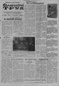 ПРОЛЕТАРИИ ВСЕХ СТРАН, СОЕДИНЯЙТЕСЬ! На агитпункте Ярко светятся по вечерам огни в клубе элеватора. Еще издали бросается в глаза просвечивающееся кумачевое полотнище с надписью: „Агитпункт", а выше транспарант: „18 выборов в вого. Затем перед избирателями с интересным и содержательным концертом выступили участники художественной самодеятельности клуба. Исполнителей зрители встретиОрган Карасукского райкома Коммунистической партии Советского Союза и районного Совета депутатов трудящихся Новосибирской области КИО (2968; |СРЕДА,24 января 1962 Г. j ЦЕНА 2 коп. В честь выборов ЗА ВЫСОКИЙ УРОЖАЙ Уходя в очередной, кратковременный отпуск, М. А. Пахолкин давал наказ механизаторам о том, чтобы намеченные агромероприятия были выполнены полностью. Находясь в отпуске, коммунист, хозяин бригады, интересовался делами механизаторов. А когда М. А. Пахолкин приступил к работе, товарищи его встретили хорошей вестью: бригада управилась с планом по вывозке навоза на поля. Вместо пяти тысяч тонн вывезено 5090. Сейзадержанпе снега ведут все отделения Хорошпнского совхоза. На площади более 2 тысяч га пролегли снежные валы. Вывозится навоз па поля, готовятся к посеву семена. Они уже полностью очищены, и образцы семян повторно отправлены в контрольно-семенную лабораторию для проверки на сорность. По всхожести они кондиционные. Так коллектив совхоза борется за достойную встречу выборов в Верховный Совет СССР. марта — день Верховный Совет СССР". Сюда после трудового дня направляются не только рабочие элеватора, но и многие жители с ближайших улиц. Агитаторы заранее их уведомили, что для избирателей проводится вечер. В агитпункт люди приходят задолго до начала вечера. Здесь можно встретить пожилых супругов Муковоз Григория Игнатьевича и Цомну Васильевну, совсем молодую дизелист- ку элеватора ■ Светлану Певцову, участника само- деятельности Юрия Логинова и других избирателей. Одни из них беседуют с агитаторами десятидво- рок, другие читают газеты, журналы, любители шахмат склонились над шахматной доской. ли дружными одобрительными аплодисментами. Клуб элеватора—это не только место отдыха,это пункт большой агитационно-массовой работы. Работа при клубе не прекращалась и ранее. Сейчас, в связи с предстоящими выборами в Верховный Совет СССР партийная организация активизировала работу агитпункта. На пункте постоянно находятся дежурные. Бюро утвержден коллектив агитаторов в количестве двадцати человек для работы с избирателями на десятидворках. Среди агитаторов коммунисты. И.П. Масаев, М. А. Леонидчен- ко, кандидат в члены КПСС Е. М. Рубис, комсомольцы и беспартийные. Многих из них избираВ помощь агитатору—так называется стенд, организованный в районной библиотеке в связи с предстоящими выборами в Верховный Совет СССР. На стенде специально подобранная для агитаторов литература. ем, механизаторы ведут снегозадержание. По примеру передовой бригады В. Черненький, Вечер начинается в наз- главный агроном Хороший- наченное время лекцией ского совхоза. нарсуды! района т. ГореНа отлично В ночь на 20 яивчря на от лично сработала смена дежур ного ио ст., Карасук 1 Д II. Привалова. Полностью выполнен график пропуска и отправления ш ездов. Скоростная обработка поездов позволила сократить простой транзитного вагона на 42 минуты. Своими силами смена ночью выгрузила ком