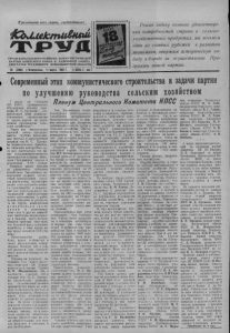 П ролетарии всех стран, соединяйтесь! ТР¥Д ОРГАН КАРАСУКСКОГО РАЙКОМА КОММУНИСТИЧЕСКОЙ ПАРТИИ СОВЕТСКОГО СОЮЗА И РАЙОННОГО СОВЕТА ДЕПУТАТОВ ТРУДЯЩИХСЯ НОВОСИБИРСКОЙ ОБЛАСТИ 30 (2988) | Воскресенье, 11 марта 1962 Г. | ЦЕНА 2 коп. Решив задачу полного удовлетворения потребностей страны в сельскохозяйственных продуктах, мы возьмем один из главных рубежей в развитии экономики, одержим историческую победу в борьбе за осуществление Программы нашей партии. Современный этап коммунистического строительства и задачи партии и по улучшению руководства сельским хозяйством 7 марта на Пленуме ЦК КПСС продолжалось обсуждение доклада товарища Н. С. Хрущева— „Современный этап коммунистического строительства и задачи партии по улучшению руководства сельским хозяйством**. Через все выступления красной нитью проходит мысль: глубоко продуманные выводы и предложения доклада тов. Н. С. Хрущева исключительно правильно намечают конкретные пути для достижения тех высот сельскохозяйственного производства,которые намечены Программой партии и решениями XXII съезда. Создание новых органов по управлению сельским хозяйством, быстрейшее искоренение вредных последствий травопольной системы земледелия, интенсификация сельскохозяйственного производства и повышение его культуры,роста материальной заинтересованности колхозников и работ ников совхозов в результате их труда, комплексная механизация земле- делия и животноводства—эти и другие важнейшие проблемы затрагиваются в каждом выступлении. Многие ораторы отмечали, что большой вред сельскому хозяйству в свое время нанес культ личности И.В.Сталина. Представители республик, краев и областей в своих выступлениях информируют Пленум ЦК о том, что делается для быстрейшего подъема сельского хозяйства. Первым на утреннем заседании 7-го марта выступил секретарь ЦК Кимму- нистической партии Грузии В. П. Мжаванадзе. Он, в частности, отметил, что в докладе тов. Н. С. Хрущева убедительно доказано, что се 1ьскохозяйственное производство имеет не меньшие возможности роста,ч> м промышленнос1ь. Использование этих возможн 1стей зависит от уровня руководства. Но если в промышленности строго соблюдаются определенные технологические законы, то в сельском хозяйстве агротехнические правила еще не стали обязательными для многих колхозов и совхозов. А это необходимо. Пленум Центрального Комитета КПСС Тов. Мжаванадзе также подчеркнул необходимость увеличения материальной заинтересованности, ее важное значение для поднятия производительности труда в сельском хозяйстве. Оратор затем сообщил, что делают коммунисты и народ Грузии для лучшего использования благодатных земель этой солнечной республики. Секретарь ЦК Коммунистической партии Эстонии тов. И.Г. Кэбин привел интересные данные о результатах труда эстонских животноводов. За истекшие три года семилетки колхозы и совхозы республики на 79 процентов увеличили производство мяса, на 37 процентов—производство молока.За это же время государственные заготовки мяса увеличились более чем вдвое. Есть хозяйства, где уже сейчас на 100 гектаров паш ни производят по 50 центнеров мяса. В частности, такого замечательного результата достиг совхоз имени Ленина. Примечательно при этом следующее. Как сообщил тов. Кэбин, такие результаты в основном достигнуты за первые два года с