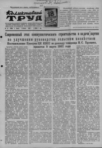 'I'JP’VA ОРГАН КАРАСУКСКОГО РАЙКОМА КОММУНИСТИЧЕСКОЙ ПАРТИИ СОВЕТСКОГО СОЮЗА И РАЙОННОГО СОВЕТА ДЕПУТАТОВ ТРУДЯЩИХСЯ НОВОСИБИРСКОЙ ОБЛАСТИ № 31 (2989) | Среда, 14 марта 1962 Г. | ЦЕНА 2 коп. Пролетарии всех стран, соединяйтесь! Дальнейший подъем сельского хозяйства—одна из главных, неотложных и вместе с тем одна из трудных задач коммунистического строите льства. Уровень развития сельского хозяйства в значительной мере определяет благосостояние народа, продвижение страны по пути к коммунистическому изобилию. Поэтому дальнейший подъем сельского хозяйства, увеличение производства продуктов питания должно стать делом всей партии, делом всего народа. (ИЗ ПОСТАНОВЛЕНИЯ ПЛЕНУМА ЦК КПСС). Современный этап коммунистического строительства и за дачи партии по улучшению руководства сельским хозяйством Постановление Пленума ЦК КПСС по докладу товарища Н. С. Хрущева, Заслушав и обсудив доклад товарища Н. С. Хрущева «Современный этап коммунистического строительства и задачи партии по улучшению руководства сельским хозяйством», Пленум Центрального Комитета КПСС целиком и полностью одобряет изложенные в докладе анализ положения дел в сельском хозяйстве и конкретные мероприятия, направленные на практическое осуществление решений XXII съезда партии и новой Программы КПСС о создании изобилия сельскохозяйственных продуктов в стране? Советский народ с энтузиазмом и горячим одобрением встретил исторические решения XXII съезда КПСС, Программу Коммунистической партии как выражение своих коренных интересов. Братские коммунистические партии, мировое рабочее и национально- освобедительное движение оценивают новую Программу КПСС как выдающийся документ творческого марксизма-ленинизма, в котором ясно определены перспективы коммунистического строительства, даны ответы на коренные вопросы современности, указан путь борьбы против империализма и колониализма, к свободе, миру и счастью народов. Сила Программы КПСС заключается в том, что она рассматривает коммунизм всесторонне, как строй всеобщего равенства и справедливости, как такую фазу развития человечества, когда будет достигнут небывалый рост производительных сил общества и обеспечен самый высокий жезнен- ный уровень трудящихся. Руководствуясь учением Маркса—Энгельса—Ленина, партия включила в свою Программу научно разработанный план создания материально-технической базы коммунизма как главную экономическую задачу, как верный путь к осуществлению великого принципа коммунизма: «От каждого—по способностям, каждому—по потребностям». Этот ленинский курс нашей партии поддерживается всем советским пародом, мировым коммунистическим движением и прогрессивным человечеством. Строительство коммунизма стало для всех советских людей самым важным и родным делом. Советских людей и наших многочисленных друзей за рубежом радует то, что за последние годы достигнуты крупные успехи в дальнейшем развитии экономики,науки и культуры, из года в год возрастает экономическая мощь страны, повышается благосостояние трудящихся. Успешно выполняются задания семилетнего плана по развитию решающей отрасли экономики—промышленности. Валовая продукция промышленности за истекшие три года семилетки увеличилась на 33 процента вместо 27 процентов, предусмотренных принятое 9 марта 1962 года контрольными ци