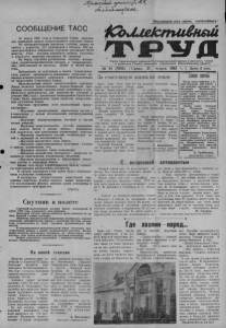 СООБЩЕНИЕ ТАСС Пролетарии всех стран, соединяйтесь I ТРУД Орган Карасукского райкома Коммунистической партии Советского Союза и районного Совета депутатов трудящихся Новосибирской области № 34 (2992) I Среда, 21 м арта 1962 г. | Цена 2 коп. 16 марта 1962 года в Советском Союзе произведен очередной запуск искусственного спутника Земли. По предварительным расчетам, спутник вышел на орбиту с перигеем 217 километров и апогеем 980 километров.Период обращения спутника составляет 96,35 минуты. Угол наклона плоскости орбиты спутника к плоскости экватора составляет 49 градусов. На борту спутника установлена научная аппаратура, радиотелеметрическая система и радиопередатчик, работающий на частотах 20,003 и 90,018 мегагерц. Наблюдение за спутником и прием телеметрических данных производятся наземными пунктами командно-измерительного комплекса, расположенными на территории Советского Союза. Произведенный запуск искусственного спутника Земли является продолжением осуществляемой программы исследования верхних слоев атмосферы и космического пространства, для выполнения которой в течение 1962 года с различных космодромов Советского Союза будет произведена серия запусков искусственных спутников Земли. Научная программа этих исследований предусматривает: —Изучение концентрации заряженных частиц в в ионосфере с целью исследования распространения радиоволн; —Изучение корпускулярных потоков и частиц малых энергий; — Изучение энергетического состава радиационных поясов Земли с целью оценки радиационной опасности, при длительных космических полетах; —Изучение первичного состава космических лучей и вариаций их интенсивности; —Изучение магнитного поля Земли; —Изучение коротковолнового излучения Солнца и других космических тел; —Изучение верхних слоев атмосферы; —Изучение воздействия метеорного вещества на элементы конструкции космических объектов; —Изучение распределения и образования облачных систем в атмосфере Земли. Кроме того будут отрабатываться многие элементы конструкции космических аппаратов. О пусках спутников этой серии будут опубликованы отдельные сообщения. В результате осуществления намеченной программы советские ученые получат новые возможности исследования физики верхних слоев атмосферы и космического пространства. (ТАСС). Спутник в полете Советский искусственный спутник Земли, запущенный 16 марта 1962 года, продолжает свое движение. Последняя ступень ракеты-носителя также движется по орбите, близкой к орбите спутника. Обработка измерительной информации подтвердила хорошее совпадение действительной орбиты с расчетной. Научная аппаратура, установленная на борту спутника, функционирует нормально. В координационно-вычислительный центр поступают многочисленные данные о приеме радиосигналов спутника. Регистрация сигналов, излучаемых спутником, на объявленных двух частотах дает новые возможности для изучения ионосферы. Первые результаты, полученные с помощью научной аппаратуры, обрабатываются. На новой станции Широко развернулись работы на ст. Ка расу к-Ш.Здесь большим фронтом идет укладка и балластировка путей. Уже уложено половина запроектированных станционных путей. Укладку ведет путевая колонна СМП-16 иод руководством В. Пилипенко. Эта колонна прославилась хорошими трудовыми делами на линии Карасук-1, Т