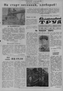 На старт весенний, хлебороб! --- -------:----* *------------- - От~нас, от доблестного труда советских людей, от высокой сознательности, дисциплины и организованности каждого труженика сельского хозяйства зависят наши успехи в подъеме сельскохозяйственного производства. Подобно тому, как из маленьких ручейков образуются полноводные реки и моря, так и трудом каждого советского человека наполняется чаша коммунистического изобилия. (Из Обращения ЦК КПСС) - --------- ----* ж-- —--------- НА ПОЛЕВОМ'СТАНЕ На .полевом стане, что расположен в^не- с кальках километрах южнее центральной усадьбы артели „Вперед к коммунизму", стало оживленно. Сюда завозятся плуги, сеялки, бороны и прочий мелкий инвентарь, подготовлен стан. К услугам механизаторов—выбеленные комнаты, спальни. В оставшиеся до полевых работ дни все в колхозе озабочены подготовкой к весенне-посевной кампании. Член КПСС А. Фадеев работает зав. гаражом, но он не ограничивается узким кругом своих обязанностей. В свободное время помогает шосрерам оборудовать машины ГАЗ-51 для механической засыпки семян. На снимке: А. Фадеев. Текст и фото Л. Рогозного. Вышли на старт (Принято по телефону). Трактористы 2-й бригады сельхозартели „Маяк Ильича' И. Макаров, Л. Сайберт и А.Шуленов первыми в колхозе подготовились к весенним полевым работам. Они уже вывели на полосу свои агрегаты. Механизаторы будут работать без прицепщиков. ■—Вспашку и сев проведем в сжатые сроки, —так решили хлеборобы колхоза в ответ на решения мартовского Пленума ЦК КПСС. На Пролетарии всех стран, соединяйтесь! ОРГАН КАРАСУКСКОГО РАЙКОМА КОММУНИСТИЧЕСКОЙ ПАРТИИ СОВЕТСКОГО СОЮЗА И РАЙОННОГО СОВЕТА ДЕПУТАТОВ ТРУДЯЩИХСЯ НОВОСИБИРСКОЙ ОБЛАСТИ № 40 (2998) | Среда, 4 апреля 1962 Г. | ЦЕНА 2 коп. большуно дорогу Последние хлопоты Ранняя в этом году весна. Начался апрель, а поля уже освободились от снега.Механизаторы первого отделения Хо- рошинского совхоза (управляющий т. Панкратьев) все сцепы с инвентарем для первой предпосевной обработки вывели на поля. К 5 апреля эта работа будет проделана на всех отделениях. Сейчас рабочие заняты по- ► следнпми предпосевными хлопотами. Протравливают гранозаном семена, осматривают технику, делают расстановку рабочей -силы. 5 апреля все механизаторы съедутся в центр совхоза на совещание, чтобы договориться как лучше провести весенний сев в четвертом году семилетки. В. Черненький. ДИВУ даешься, когда вдумываешься в строки и цифры Программы КПСС. Какой размах, какой рывок предстоит совершить нашему народу во всех областях народного хозяйства, науки и культуры! Мне, механизатору-хлеборобу, особенно близки и понятны планы партии в области. дальнейшего подъема сельского хозяйства. Довести производство зерна в ближайшее десятилетие до 14 миллиардов пудов, а к 1980 ГОДУ—ДО 18—19 миллиардов пудов —это здорово, гигантски! Да иначе и быть не может :мы строим коммунизм. «Земля,— как указано в Обращении ЦК КПСС,— всенародное богатство, и мы обязаны взять от нее все, что она может дать». У нас сейчас есть все необходимое для резкого подъ-' ема сельского хозяйства. Взять машины. Не только в мирное время, но и в суровые годы войны по фронтовым дорогам водил ки уже давно отслужили свой срок, а я думаю еще не один' год поработать на своем «старичке». Ведь на мартовском Пленуме ЦК КПСС говорилось об умелом использовании имеющейся техники. По-хоз
