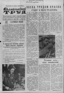 Пролетарии всех стран, Соединяйтесь! ВЕСНА ТРУДОМ КРАСНА ГУДЯТ В ПОЛЕ ТРАКТОРЫ ОРГАН КАРАСУКСКОГО РАЙКОМА КОММУНИСТИЧЕСКОЙ ПАРТИИ СОВЕТСКОГО СОЮЗА И РАЙОННОГО СОВЕТА ДЕПУТАТОВ ТРУДЯЩИХСЯ НОВОСИБИРСКОЙ ОБЛАСТИ № 45 (3003) | Воскресенье, 15 апреля 1962 Г. j ЦЕНА 2 коп. И УДАРНИКИ ПОЛЯ ПО ДВЕ НОРМЫ за смену вырабатывают на весновспашке трактористы 7-й фермы, совхоза им. Дзержинского Я. А. Шнайдер и А. А. Зим- баль. На 6-й ферме того же совхоза перевыполняют нормы выработки по весновспашке трактористы Владимир Прохоренко и В. В Дрючков и на прибивке влаги Валентин Гринченко. В НОЧНЫХ УСЛОВИЯХ пришлось трудиться 13 апреля трактористу 1-й бригады колхоза ,Маяк Ильича" И. Г. Шемякову. На тракторе „С 80“он вспахал 15 га земли вместо 13 по норме. В том же колхозе тракторист ЕЖ. Децель на тракторе „Беларусь" за три дня засеял 160 га донника при норме 54 га, а тракторист Анатолий Микушин—170 га на „ДТ-54". В СТУДЕНОВСКОМ СОВХОЗЕ тракторист В. П. Жуков на „ДТ-54“ за два дня прибил влагу на площади 89 га при норме 65. ХОРОШО трудятся в колхозе им. Тельмана на весновспашке трактористы Я. №. Кулям- пин и В. В. Обухов. 0 председателе исполкома районного Совета депутатов трудящихся Решение Карасукского районного-Совета депутатов трудящихся (восьмого созыва), принятое на восьмой сессии 10 апреля 1962 года Карасукский районный Совет депутатов трудящихся РЕШИЛ: 1. Освободить от обязанностей председателя исполкома райсовета В. И. Клочкова в связи с переходом на партийную работу. ' . 2. Избрать председателем исполкома райсовета А. Д. Смирнова—депутата от Акпановского избирательного округа № 28. 3. Считать выбывшим из состава членов исполкома П. И.Зубарева. 4. Отвести из состава членов исполкома Н. И. Заского в связи с переходом на работу в аппарат обкома партии. 5. Избрать членом исполкома А. А. Мелехова—депутата от Индустриального избирательного округа № 13 и А. П. Барило— депутата от Михайловского избирательного округа № 31. Председатель исполкома районного Совета депутатов трудящихся А. СМИРНОВ И. о. секретаря исполкома районного Совета депутатов трудящихся И. ПЕРЕПЕЛИЦИН Ио обе стороны тракта, что идет в Веселовский, Краснозерскийи вдругие районы, широко разметнулись массивы посевных площадей артели «Вперед к коммунизму». Днем и ночью гудят на полях тракторы. Одни прибивают влагу, пашут целину, другие ведут лущевие стерни, сев донника. На полевых работах с первых же дней механизаторы стали перевыполнять нормы выработки. Кандидат в члены партии Александр Лель на лущении стерни при норме 50 га выполняет по 60 за смену. Владимир Байгаринов дает по 120 процентов нормы на прибивке влаги. Не ограничиваются нормой Леонид Пирогов, Сергей Калачиков. Желание механизаторов сделать как можно- больше за смену —не погоня за количеством: у них качество работы безупречное. Погожие стоят деньки.В степи в это время особенно оживленно. Движутся и движутся в весеннем мареве машины по полям. Многотрудная, беспокойная пора—весенняя страда началась. К полевым работам артель подготовилась заранее и всесторонне. Техника была отремонтирована задолго до прихода весны. Сейчас даже сеноуборочные машины на линейке готовности И в этом надо отдать предпочтение главному механику т. Лель. Это добрый хозяин и уважаемый в коллективе механизаторов человек. К единой цели направлены усилия парторганизации и правлен